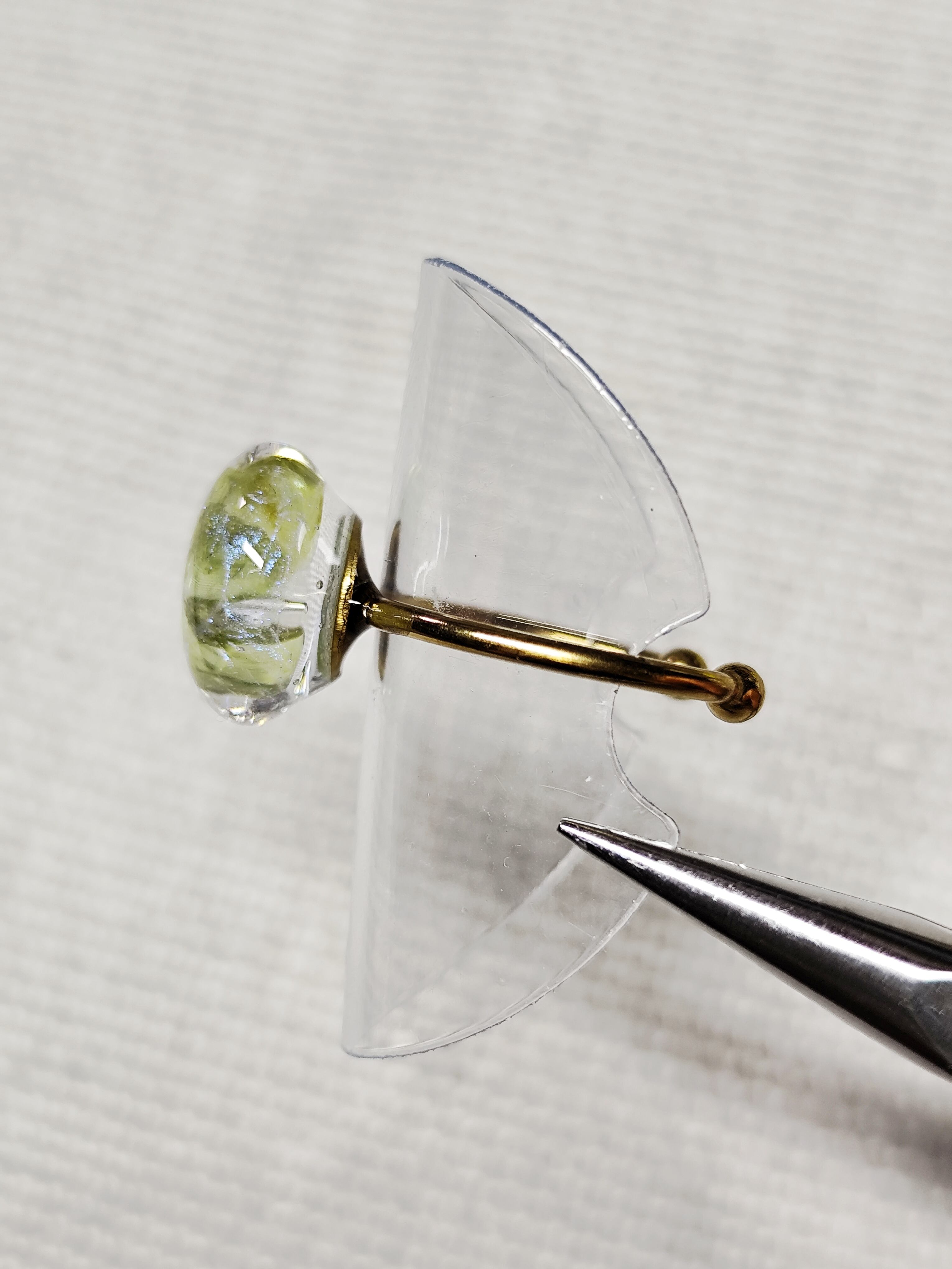 ペリドットのカケラをレジンに封入し、ホワイト系のオーロラをマーブル状にデザインしてあります。