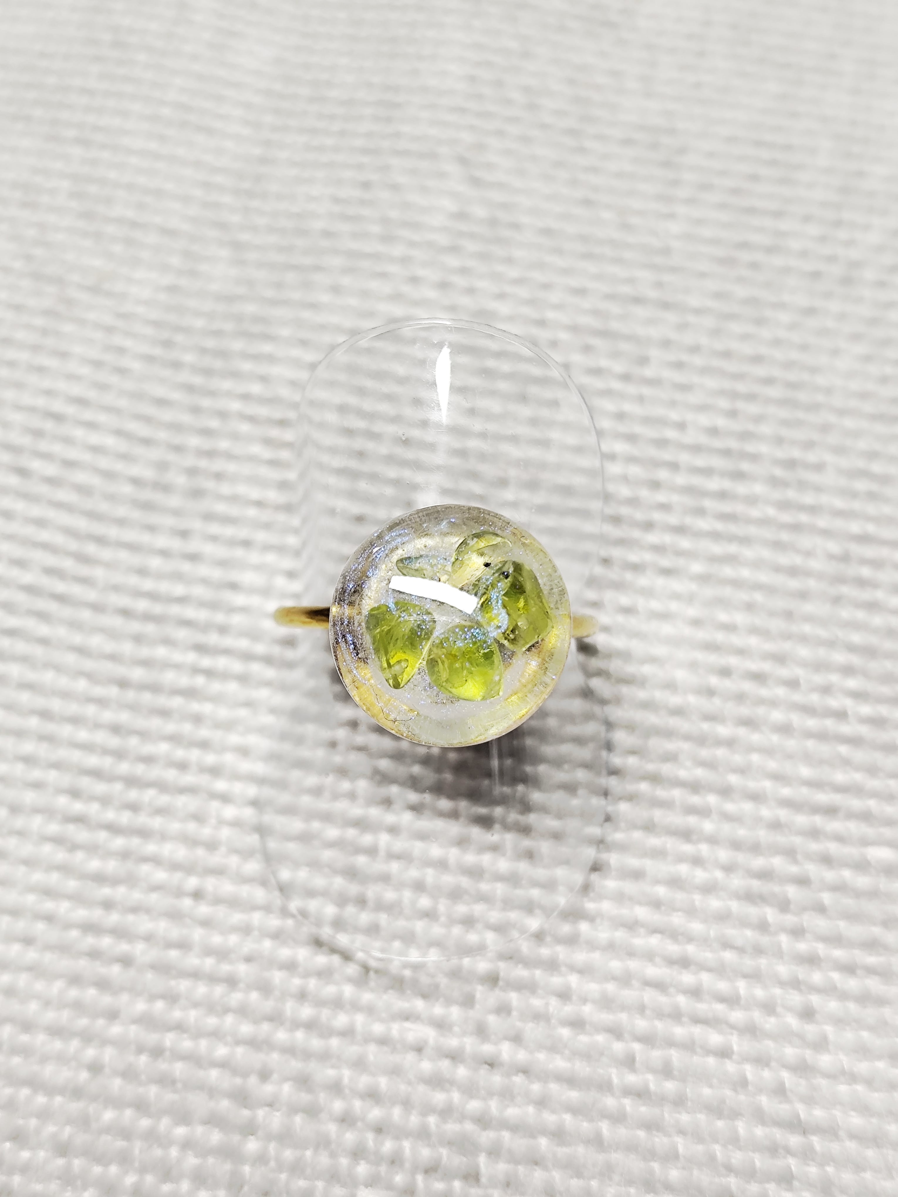 ペリドットのカケラをレジンに封入し、ホワイト系のオーロラをマーブル状にデザインしてあります。