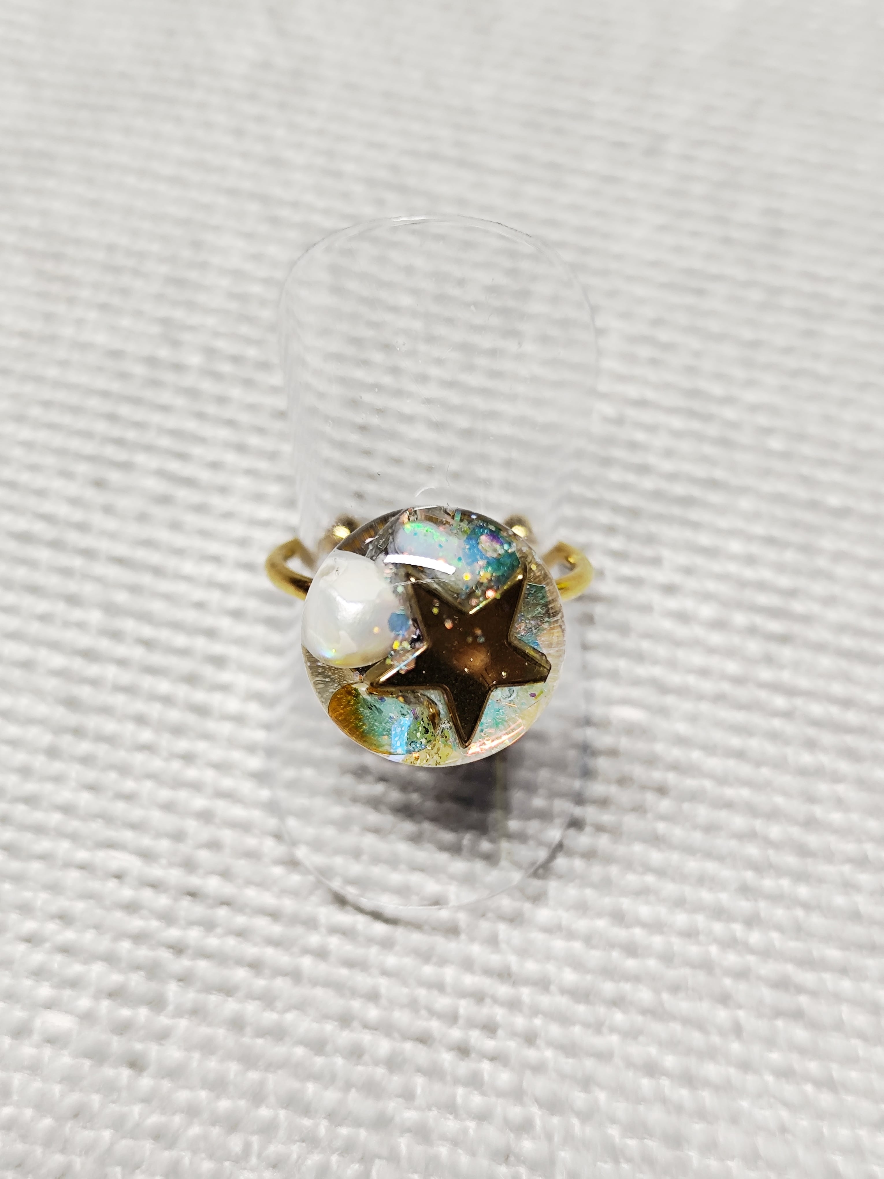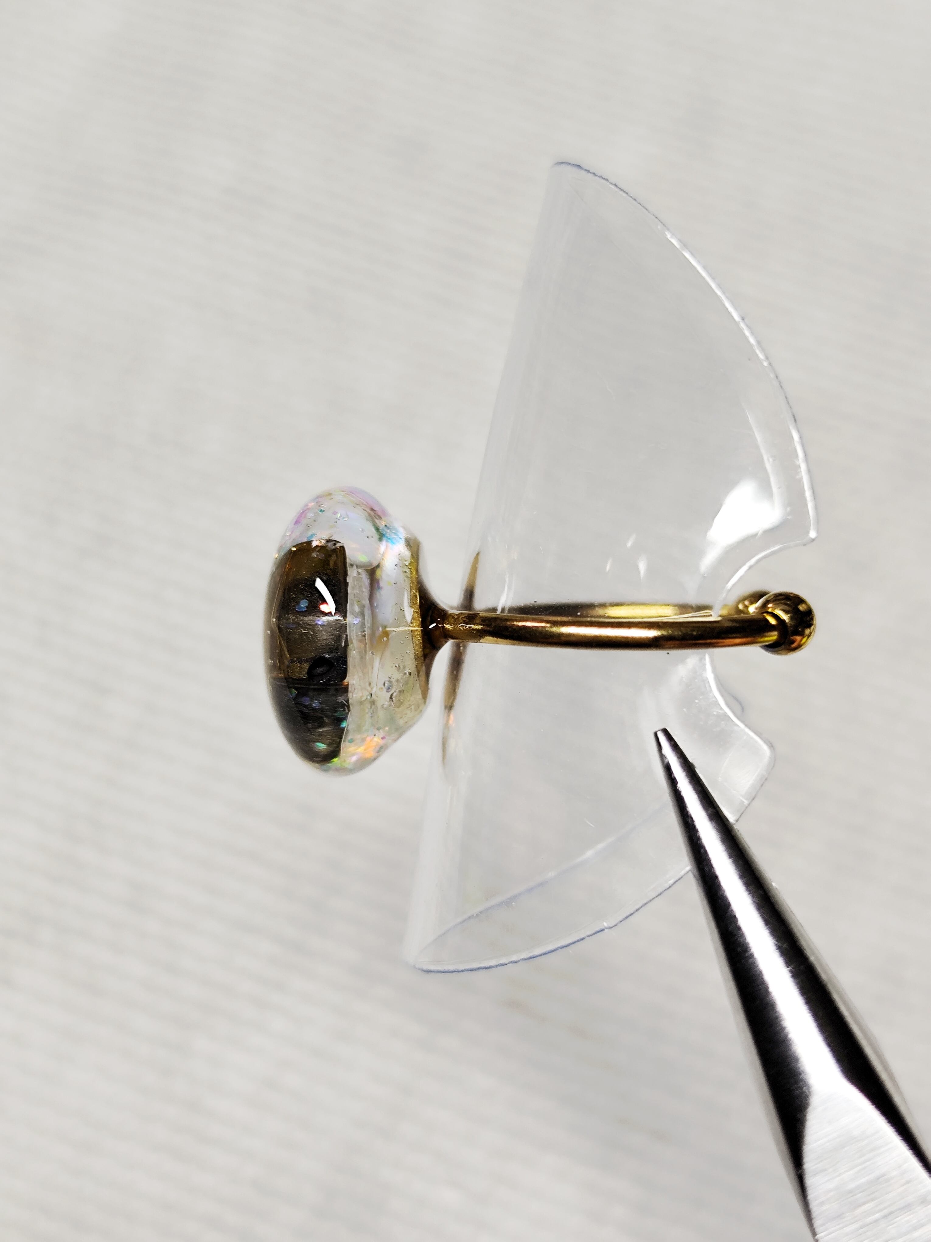 星のヘマタイト、淡水パール、エチオピアオパールをレジンに封入し、ホログラムを散りばめました。